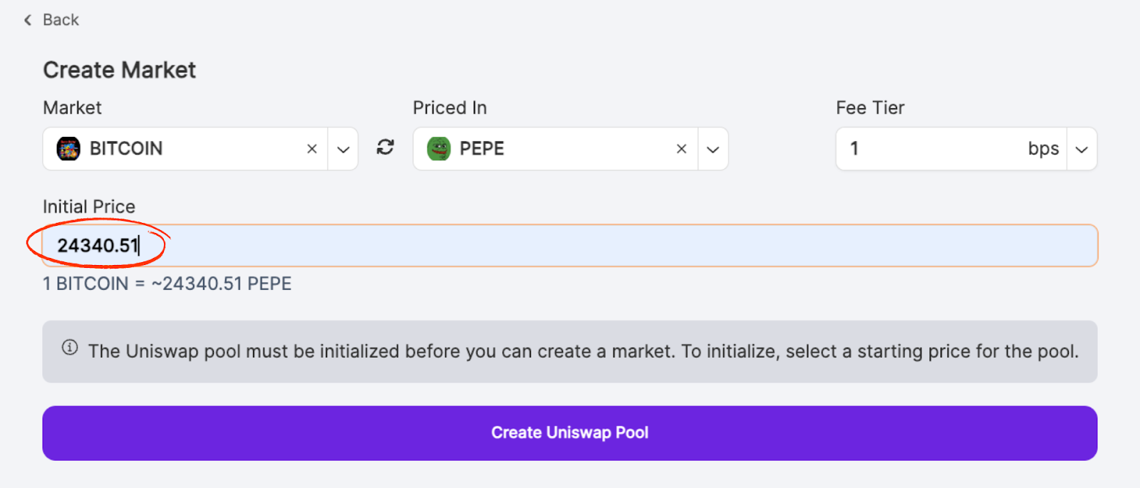 3. Create the Uniswap Pool (if needed): If a corresponding Uniswap pool doesn’t exist, you’ll be prompted to create one. Set the initial price of the Uniswap pool and click “Create Uniswap Pool.”