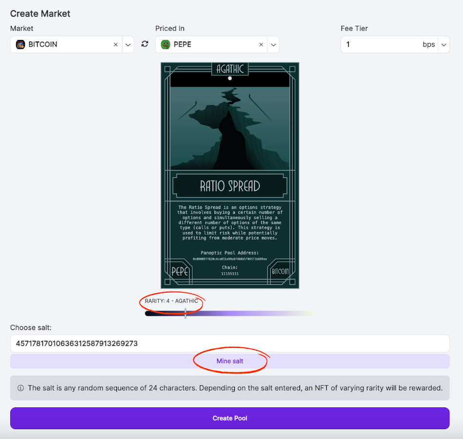 As a Panoptic market creator, you’ll earn a unique NFT that represents your pool. The rarity of your NFT depends on the number of leading zeros in your market’s contract address, making it a valuable badge of your contribution to Panoptic.
