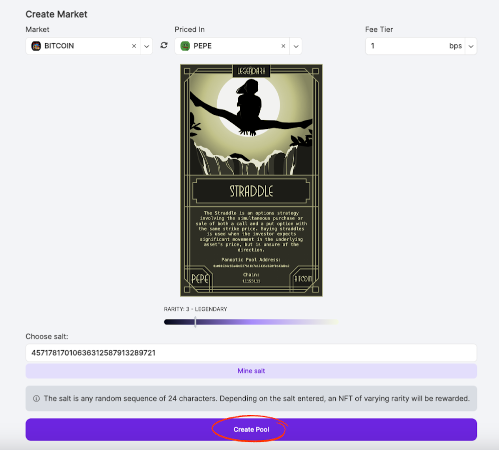 5. Launch Your Panoptic Pool: Click “Create Pool” to launch your Panoptic market. Your market will be available for trading on Panoptic within ten minutes after the corresponding Uniswap pool records a swap or LP update across at least four blocks. For a full list of requirements, refer to our docs.