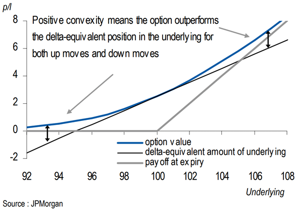 The options Greek of gamma delineates the rate of change of delta. Delta represents the slope (i.e. linear) portion of an option’s payoff curve, whereas gamma represents the curvature and convexity (i.e. nonlinear) portion of the option’s payoff curve.