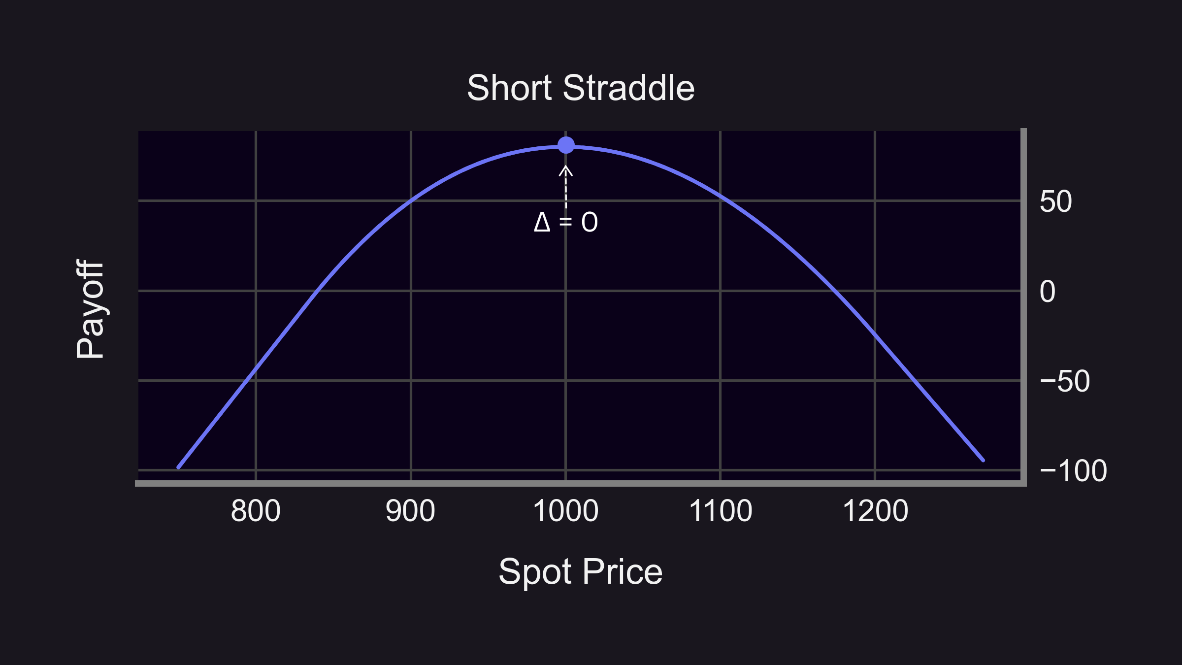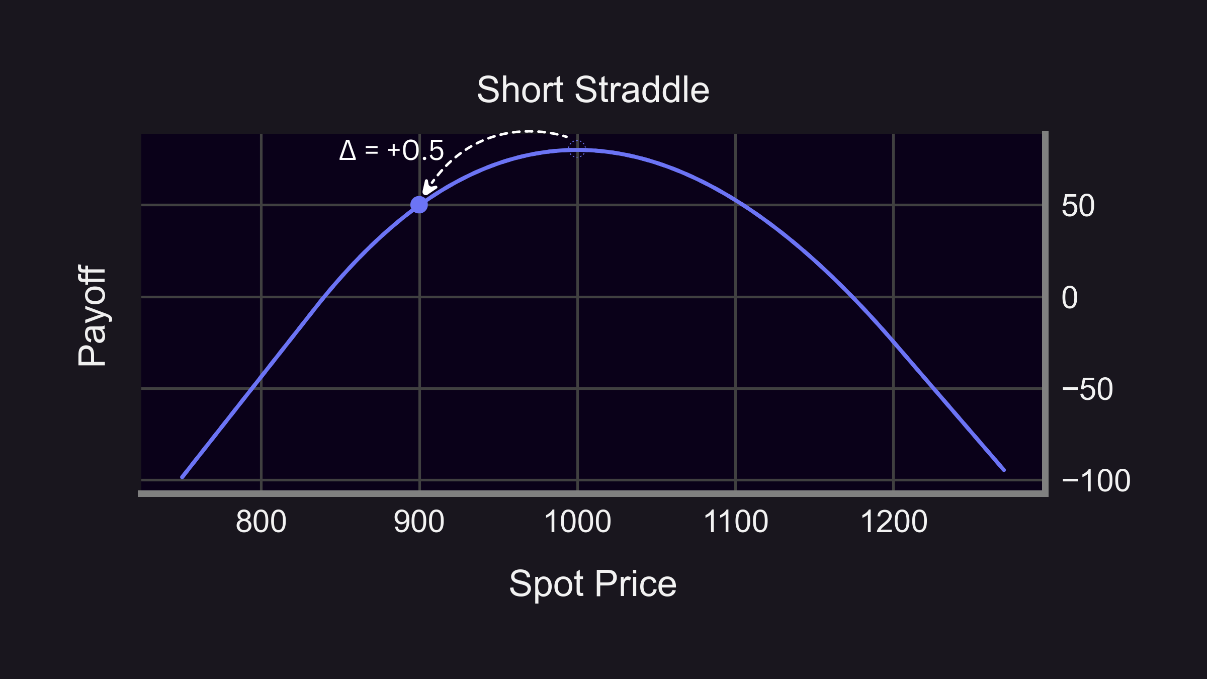 The above image displays how the profit threshold of a short straddle position is fairly narrow when incorporating underlying ETH price movement scenarios. As the initial portfolio delta shifts, there is an underlying rebalancing process needed to maintain delta-neutrality as the price of ETH either rises or falls.
