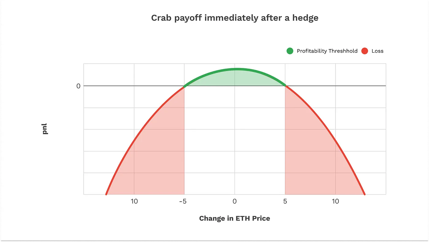 Equation 2 quantitatively shows how gamma scalpers rely on options vega being sufficiently overvalued as a byproduct of the VRP when ATM straddles are sold to end users. The all-encompassing exploitation of the VRP is also present within the prolific DeFi derivatives strategy known as the “Crab Strategy,” where the short ATM straddle position in conventional reverse gamma scalping is substituted for a short quadratic power perpetual position as a means to trade volatility, further evidenced by the graphic below.
